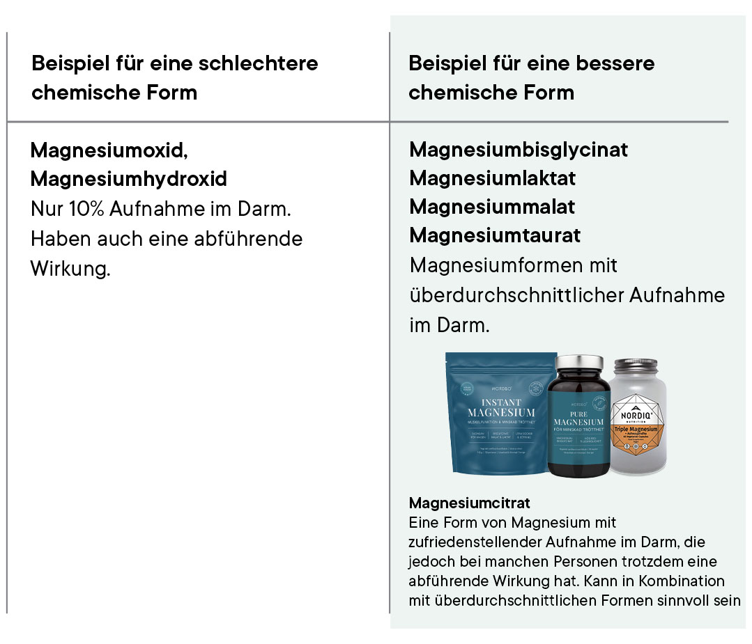 Hersteller von Nahrungsergänzungsmitteln wählen häufig günstigere chemische Formen von Vitaminen und Mineralstoffen. Diese werden vom Körper weniger gut aufgenommen und schwerer verwertet als bioaktive bzw. besser verfügbare Formen von Mikronährstoffen.